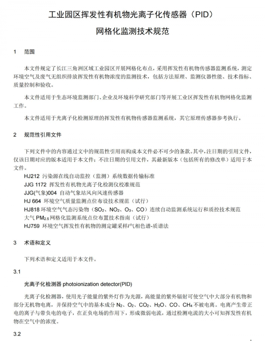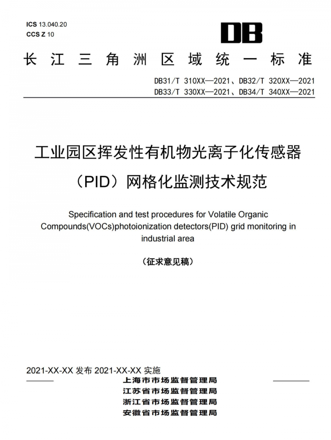 挥发性有机物(VOCs)是一类重要的环境污染物,严重威胁着环境和人类健康,近年来也出不很多相关的冶理及监测的规范和标准。但是针对PID光离子原理的监测方法一直没有一个明确的标准。针对这一情况,为推进长三角一体化发展战略实施,上海市生态环境局、江苏省生态环境厅、浙江省生态环境厅和安徽省生态环境厅共同组织起草了长江三角洲区域统一标准《工业园区挥发性有机物光离子化传感器(PID)网格化监测技术规范》(征求意见稿)。