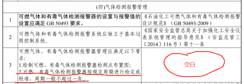 “可燃、有毒气体检测报警器按规定周期进行检定或校准,周期一般不超过一年",这里明确了气体检测报警仪需要定期进行检定或校准,但是定期没有透漏具体时间间隔,只是说了按规定周期,也就是说有明文规定的周期,应当按照明文规定周期执行,没有明文规定的周期呢,那就按照不超过一年来执行。但是应急管理部在这个要求所依据的标准规范里,居然是空白。什么意思呢,难道应急管理部门也无法找到支撑的标准规范吗?